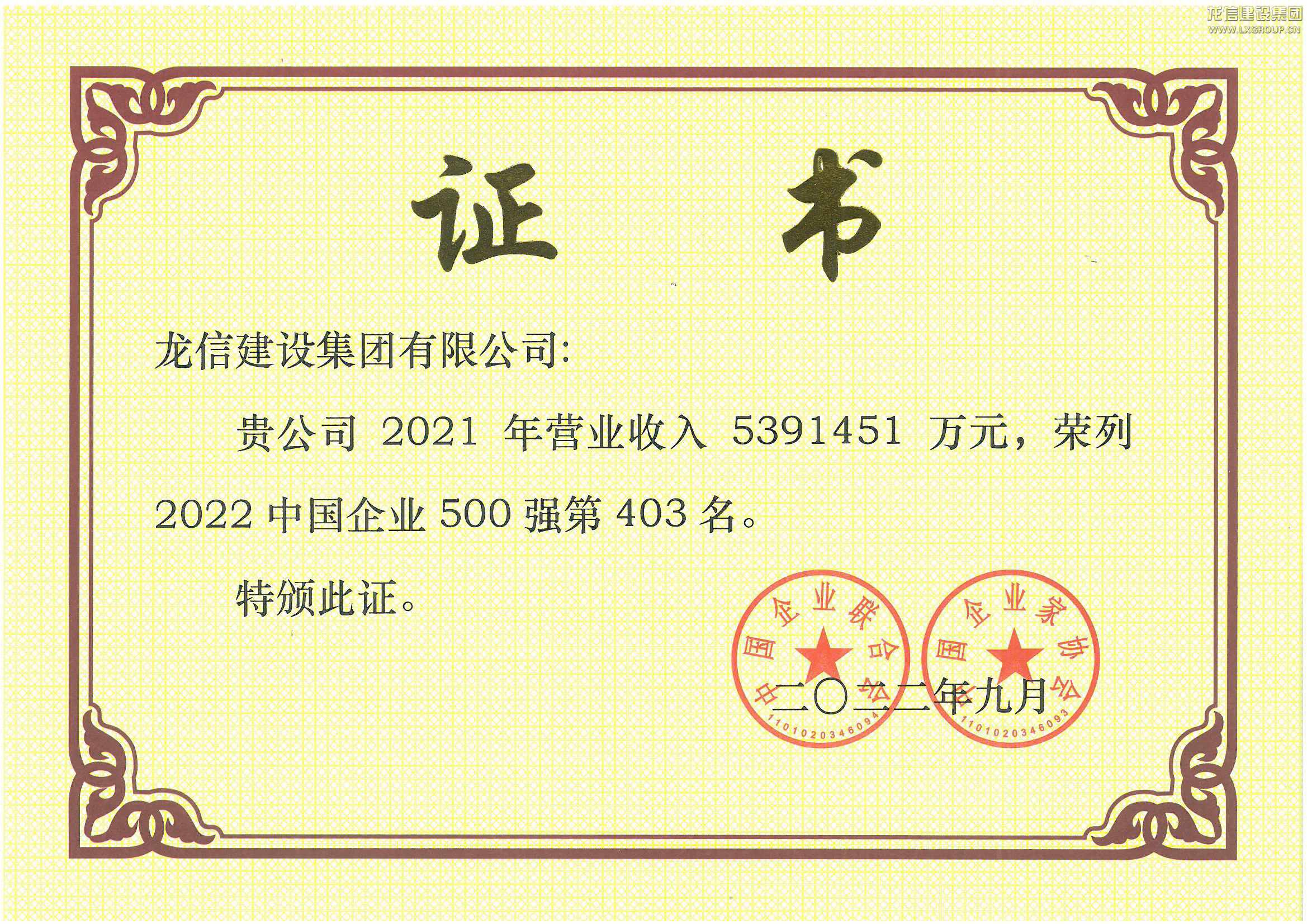 2022中國企業(yè)500強 第403位(證書)