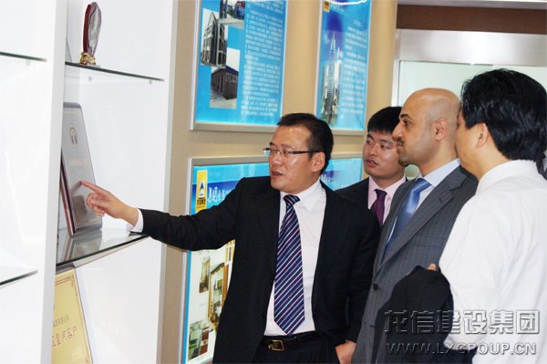 東恒盛大酒店午餐后,客人們不顧旅途勞累,饒有興趣地分別觀摩了別具一格的龍馨園小區(qū)、龍馨家園樣板房、集團(tuán)公司精裝房各類建筑材料超市、遠(yuǎn)程視頻控制室、業(yè)績展示廳。當(dāng)他得知達(dá)曼雙塔項(xiàng)目施工現(xiàn)場(chǎng)實(shí)時(shí)畫面也在寬大的屏幕上展現(xiàn)時(shí),他份外欣喜,連聲稱道。他時(shí)而緩步、時(shí)而駐足在業(yè)績展示大廳的獎(jiǎng)杯、獎(jiǎng)狀、證書前細(xì)細(xì)欣賞。他通過譯員稱贊集團(tuán)公司的輝煌業(yè)績令人敬佩!對(duì)雙方日后更加緊密廣泛的合作充滿了信心。走到展示廳門口邊,阿仆杜拉先生欣然灑脫地在電子屏幕上簽名留念。