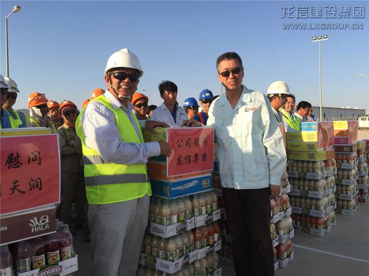 此次慰問活動中,楊清林主席走到龍信隊伍前,與龍信集團海外公司領(lǐng)導(dǎo)楊秉法與仇勇經(jīng)理進行了親切交談。他高興地表示:龍信在5家土建分包單位中任務(wù)很重,成績顯著、工作領(lǐng)先,對400多名龍信建設(shè)者付出的努力給予肯定和贊賞,對楊局親臨生產(chǎn)一線,駐守在環(huán)境如此惡劣的沙北工作表示感謝!隨后楊主席與龍信的同志們進行了合影。