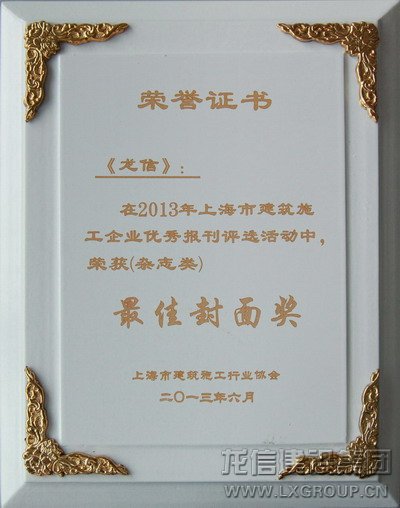 在2013年度上海市建筑施工企業(yè)優(yōu)秀報刊的評選中我公司《龍信》雜志獲評“優(yōu)秀”獎和“最佳封面”獎,“最佳封面”獎只有包括《金螳螂》在內(nèi)的3家企業(yè)雜志獲評,這次獲獎是繼2012年獲得上海市、江蘇省、國家行業(yè)協(xié)會獎項后的再次獲獎。