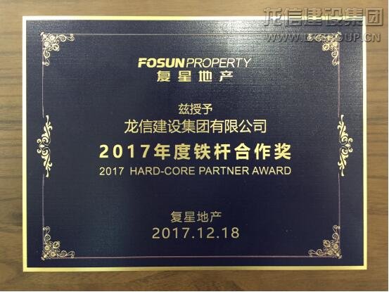 12月18日,復(fù)星地產(chǎn)2017年度“凝心聚力,共創(chuàng)未來”合作供應(yīng)商大會在上海萬達(dá)瑞華酒店勝利召開。龍信集團(tuán)被復(fù)星地產(chǎn)授予“2017年度鐵桿合作獎”榮譽(yù)稱號,龍信二分公司二部經(jīng)理施建昌應(yīng)邀出席頒獎大會并領(lǐng)獎。